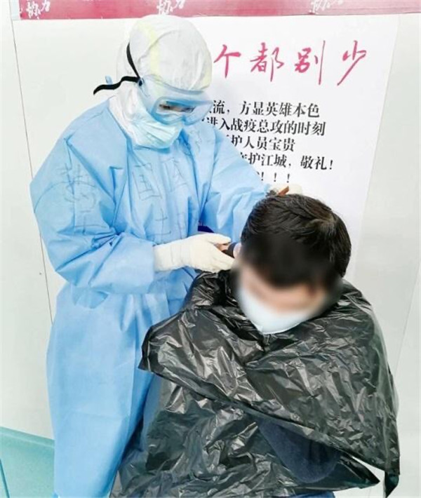 1艙有康復(fù)人員想理發(fā),手頭沒有工具,朱晴護士長得知后,聯(lián)系下個班次護士帶來推子,給大家理發(fā)。“看你動作很嫻熟啊,以前練過的吧”,“圍觀群眾”打趣道。“現(xiàn)學(xué)現(xiàn)賣,大家要求不要太高,有壓力啊!”朱晴說。一直推到推子沒電,朱晴給6位康復(fù)人員簡單修剪了頭發(fā)。得知朱晴是西安醫(yī)療隊的護士,大家都親切的稱她“肉夾饃”!