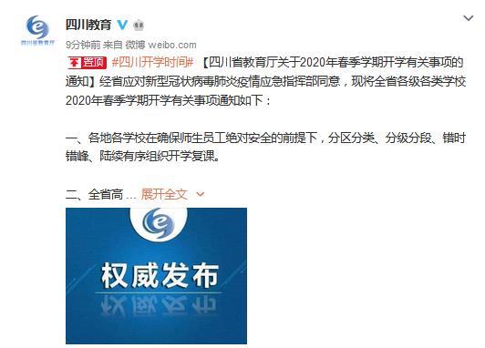 《通知》稱,經(jīng)四川省應對新型冠狀病毒肺炎疫情應急指揮部同意,現(xiàn)將全省各級各類學校2020年春季學期開學有關(guān)事項通知如下: