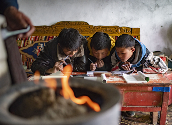 扎西卓瑪在寄宿制學(xué)校上學(xué),在校時總是很早就起床背誦課文,可在家就需要靠自覺了。