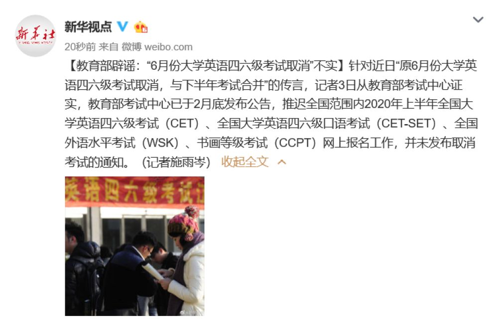 針對近日“原6月份大學(xué)英語四六級考試取消,與下半年考試合并”的傳言,記者3日從教育部考試中心證實(shí),教育部考試中心已于2月底發(fā)布公告,推遲全國范圍內(nèi)2020年上半年全國大學(xué)英語四六級考試(CET)、全國大學(xué)英語四六級口語考試(CET-SET)、全國外語水平考試(WSK)、書畫等級考試(CCPT)網(wǎng)上報(bào)名工作,并未發(fā)布取消考試的通知。