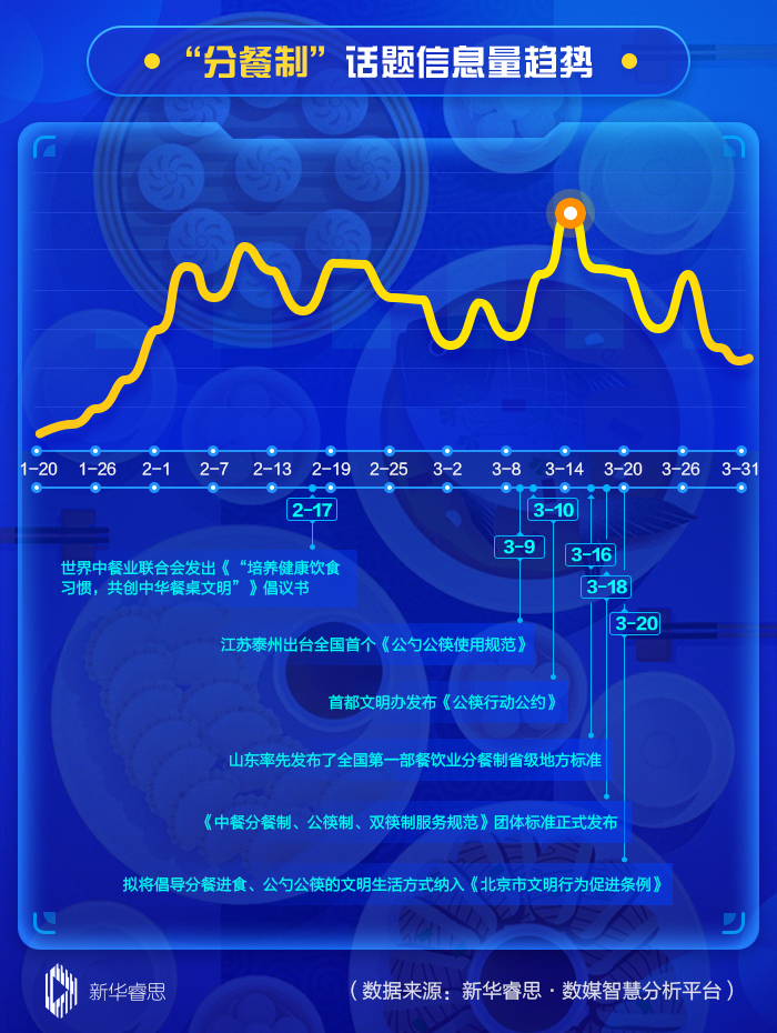 根據(jù)新華睿思·數(shù)媒智慧分析平臺(tái)數(shù)據(jù)顯示,在最近兩個(gè)月來(lái),關(guān)于分餐制話題的關(guān)注度不斷上升,全國(guó)范圍內(nèi)信息量累計(jì)達(dá)到1039539條。其中,從話題趨勢(shì)演變圖看,3月14日達(dá)到輿論熱度的首個(gè)峰值(30183條),這與北京、江蘇泰州等地發(fā)布出臺(tái)關(guān)于公筷使用的文件直接相關(guān)。