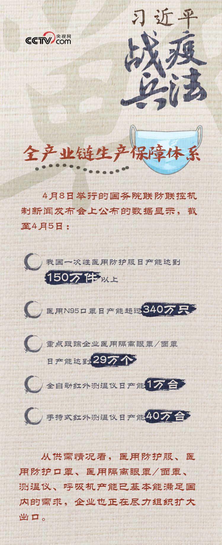 截至4月2日,國(guó)務(wù)院聯(lián)防聯(lián)控機(jī)制醫(yī)療物資保障組累計(jì)為湖北等地區(qū)調(diào)撥了醫(yī)用防護(hù)服超過(guò)800余萬(wàn)件,醫(yī)用隔離面罩(眼罩)165萬(wàn)個(gè),免洗手消毒液357噸,手持紅外測(cè)溫儀66萬(wàn)臺(tái),負(fù)壓救護(hù)車1000余輛,呼吸機(jī)等醫(yī)療救治設(shè)備超過(guò)了7萬(wàn)臺(tái)套。