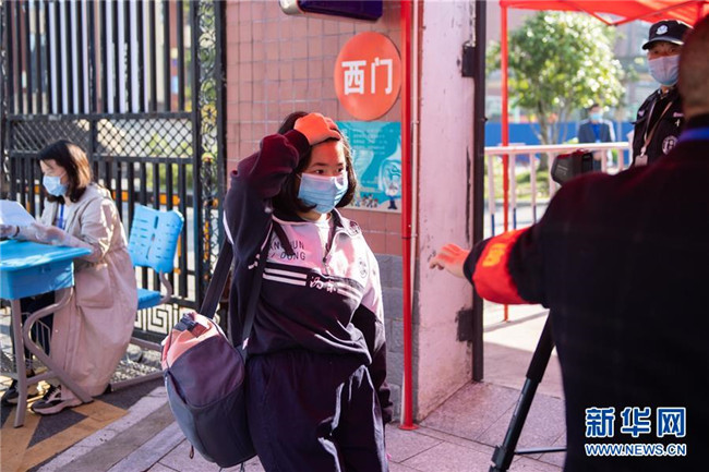 4月13日,在長沙寧鄉(xiāng)市長郡溈東中學,學生進入學校時接受體溫測量。新華社發(fā)(陳思汗 攝)