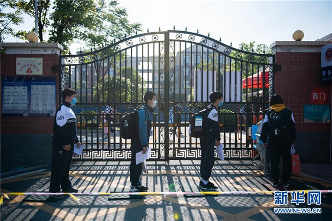4月13日,在長沙寧鄉(xiāng)市長郡溈東中學門口,學生排隊進入校園。新華社發(fā)(陳思汗 攝)