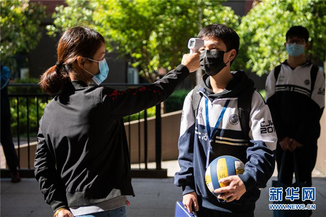 4月13日,在長沙寧鄉(xiāng)市長郡溈東中學,學生進入宿舍前接受體溫測量。新華社發(fā)(陳思汗 攝)