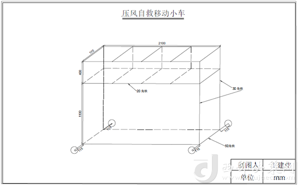 圖紙畫好后,王建業(yè)火速發(fā)給了材料員老王,老王憑借多年的人脈,在車間找來(lái)電焊師傅,又拾了廢棄的幾塊角鋼和幾個(gè)車輪,半晌就把王建業(yè)想要的東西給做了出來(lái)。其實(shí)很簡(jiǎn)單,根據(jù)壓風(fēng)自救箱的尺寸,利用扁鐵構(gòu)建整體框架,下方安裝四個(gè)滑輪即可投入使用。