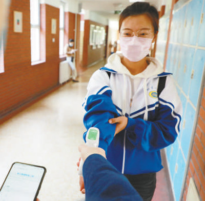 “先找到班級固定位置,根據(jù)地面標(biāo)記有間隔地排隊(duì)。”寧珂菡熟練地向記者介紹,“挨個(gè)進(jìn)入值班室后,面朝機(jī)器進(jìn)行人臉識別,然后登記信息、測量體溫,一切正常才能入校。”