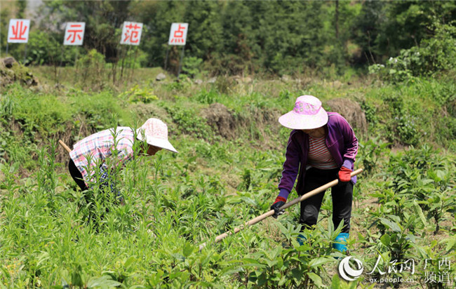 在廣西柳州市融安縣沙子鄉(xiāng)紅妙村,勞務(wù)隊成員在村集體經(jīng)濟甘蔗示范點勞作。譚凱興攝