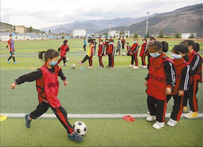 4月27日,在四川省涼山彝族自治州普格縣螺髻山鐵道兵希望學校的操場上,小球員在老師的指導下踢球。瀘州市龍馬潭區(qū)對口幫扶普格縣前方指揮部于2019年3月探索體育扶貧,在螺髻山鐵道兵希望學校組建了足球隊,從幫扶干部中選派體育教師,利用業(yè)余時間指導球隊訓練。男隊去年參加了涼山州青少年校園足球聯賽,并打進了男子組八強。王明峰 何海洋攝影報道