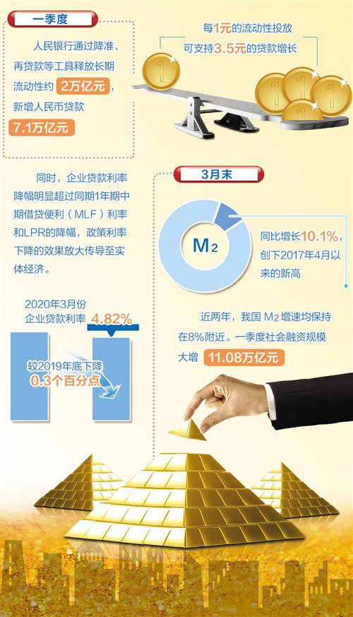 從引導(dǎo)貸款投放看,一季度中國人民銀行通過降準、再貸款等工具釋放長期流動性約2萬億元,新增人民幣貸款7.1萬億元,每1元的流動性投放可支持3.5元的貸款增長,是1∶3.5的倍數(shù)放大效應(yīng)。