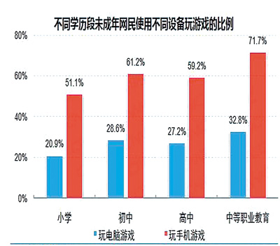 除了學(xué)習(xí)之外,網(wǎng)絡(luò)已經(jīng)成為未成年人娛樂和社交的重要工具?!秷蟾妗凤@示,聽音樂和玩游戲繼續(xù)是目前未成年網(wǎng)民的主要網(wǎng)上娛樂活動,分別為65.9%和61.0%。前者作為未成年人的娛樂方式為家長、學(xué)校等各方所接受,但是后者引起很多爭議。近年來,網(wǎng)絡(luò)游戲行業(yè)發(fā)展迅速,伴隨智能手機的普及,向未成年群體的滲透更加快速。調(diào)查顯示,61.0%的未成年網(wǎng)民會經(jīng)常在網(wǎng)上玩游戲,手機是未成年人上網(wǎng)玩游戲的主要設(shè)備。小學(xué)生網(wǎng)民玩手機游戲的比例超過一半;初中和高中生網(wǎng)民玩手游的比例分別為61.2%和59.2%;中職學(xué)生網(wǎng)民達到71.7%。短視頻是近幾年蓬勃興起的互聯(lián)網(wǎng)娛樂服務(wù)。2019年未成年網(wǎng)民在互聯(lián)網(wǎng)上經(jīng)常收看短視頻的比例達到46.2%,較2018年的40.5%提升5.7個百分點。