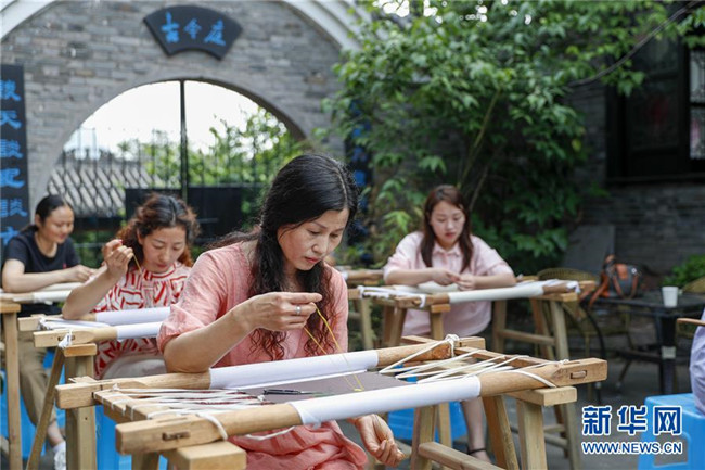 5月23日,在重慶市開州區(qū)古今庭漢繡培訓中心,漢繡繡娘在繡制文創(chuàng)產(chǎn)品。新華社發(fā)(黃偉 攝)
