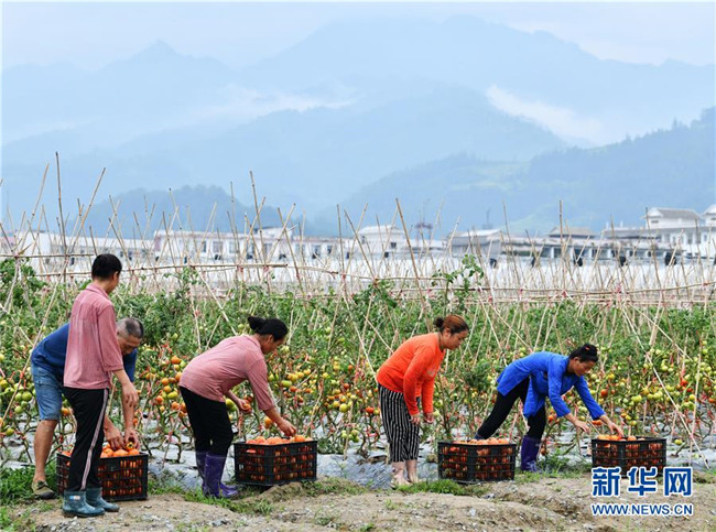 6月2日,農(nóng)民在貴州省榕江縣車江壩區(qū)采收西紅柿。 新華社記者 楊文斌 攝