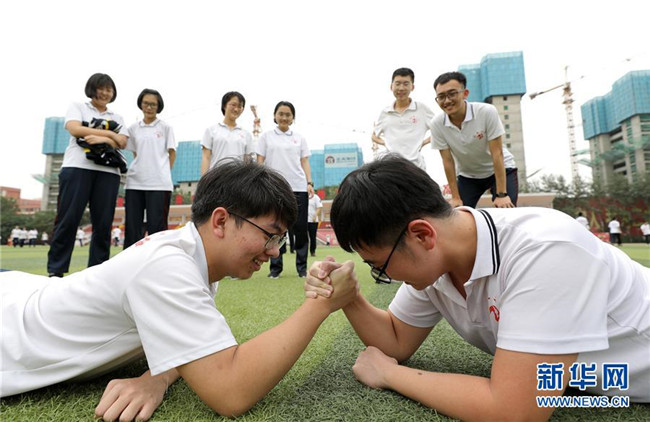 6月9日,河北省衡水市第二中學(xué)的高三學(xué)生在操場(chǎng)進(jìn)行掰手腕比賽。 新華社記者 朱旭東 攝