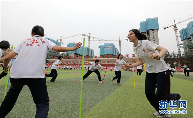 6月9日,河北省衡水市第二中學(xué)的高三學(xué)生在操場(chǎng)上參加減壓趣味游戲。新華社記者 朱旭東 攝