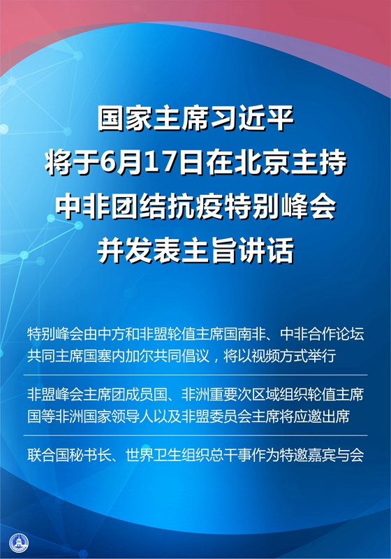 特別峰會由中方和非盟輪值主席國南非、中非合作論壇共同主席國塞內(nèi)加爾共同倡議,將以視頻方式舉行。非盟峰會主席團成員國、非洲重要次區(qū)域組織輪值主席國等非洲國家領(lǐng)導(dǎo)人以及非盟委員會主席將應(yīng)邀出席。聯(lián)合國秘書長、世界衛(wèi)生組織總干事作為特邀嘉賓與會。