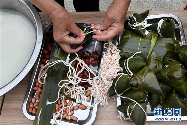 6月17日,水清溝街道居民在社區(qū)廣場(chǎng)上包粽子。新華社記者 李紫恒 攝