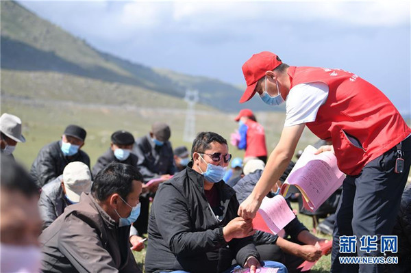 6月20日,新疆阿勒泰地區(qū)布爾津縣也格孜托別鄉(xiāng)克孜勒托蓋村村醫(yī)哈納提別克·沙旦在布爾津縣阿貢蓋提草原向參加該鄉(xiāng)牧業(yè)會議的牧民發(fā)放醫(yī)療宣傳資料。圍繞實現(xiàn)人人享有基本醫(yī)療衛(wèi)生服務目標,2016年起,新疆布爾津縣開展家庭醫(yī)生簽約服務工作。該縣組建家庭醫(yī)生簽約團隊65個,團隊醫(yī)務人員233名,通過手機APP、基本公衛(wèi)系統(tǒng)與全縣建檔立卡貧困戶進行電子化簽約,提升村醫(yī)隨訪的工作效率和質(zhì)量。截至目前,已完成簽約42936人,履約40043人。新華社記者沙達提攝