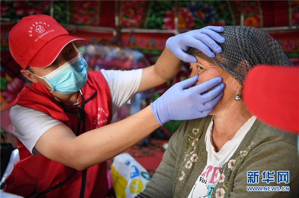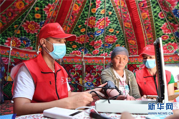 6月20日,新疆阿勒泰地區(qū)布爾津縣也格孜托別鄉(xiāng)克孜勒托蓋村村醫(yī)在布爾津縣黑流灘草原給牧民巴合提古麗·塔拉甫汗檢查身體。圍繞實現(xiàn)人人享有基本醫(yī)療衛(wèi)生服務目標,2016年起,新疆布爾津縣開展家庭醫(yī)生簽約服務工作。該縣組建家庭醫(yī)生簽約團隊65個,團隊醫(yī)務人員233名,通過手機APP、基本公衛(wèi)系統(tǒng)與全縣建檔立卡貧困戶進行電子化簽約,提升村醫(yī)隨訪的工作效率和質(zhì)量。截至目前,已完成簽約42936人,履約40043人。新華社記者沙達提攝