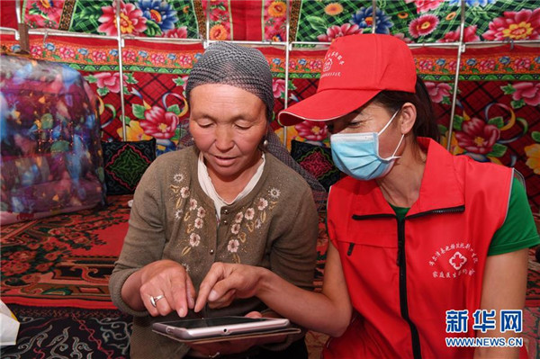 6月20日,新疆阿勒泰地區(qū)布爾津縣也格孜托別鄉(xiāng)克孜勒托蓋村村醫(yī)來到布爾津縣黑流灘草原給牧民巴合提古麗·塔拉甫汗檢查身體。圍繞實現(xiàn)人人享有基本醫(yī)療衛(wèi)生服務目標,2016年起,新疆布爾津縣開展家庭醫(yī)生簽約服務工作。該縣組建家庭醫(yī)生簽約團隊65個,團隊醫(yī)務人員233名,通過手機APP、基本公衛(wèi)系統(tǒng)與全縣建檔立卡貧困戶進行電子化簽約,提升村醫(yī)隨訪的工作效率和質(zhì)量。截至目前,已完成簽約42936人,履約40043人。新華社記者沙達提攝