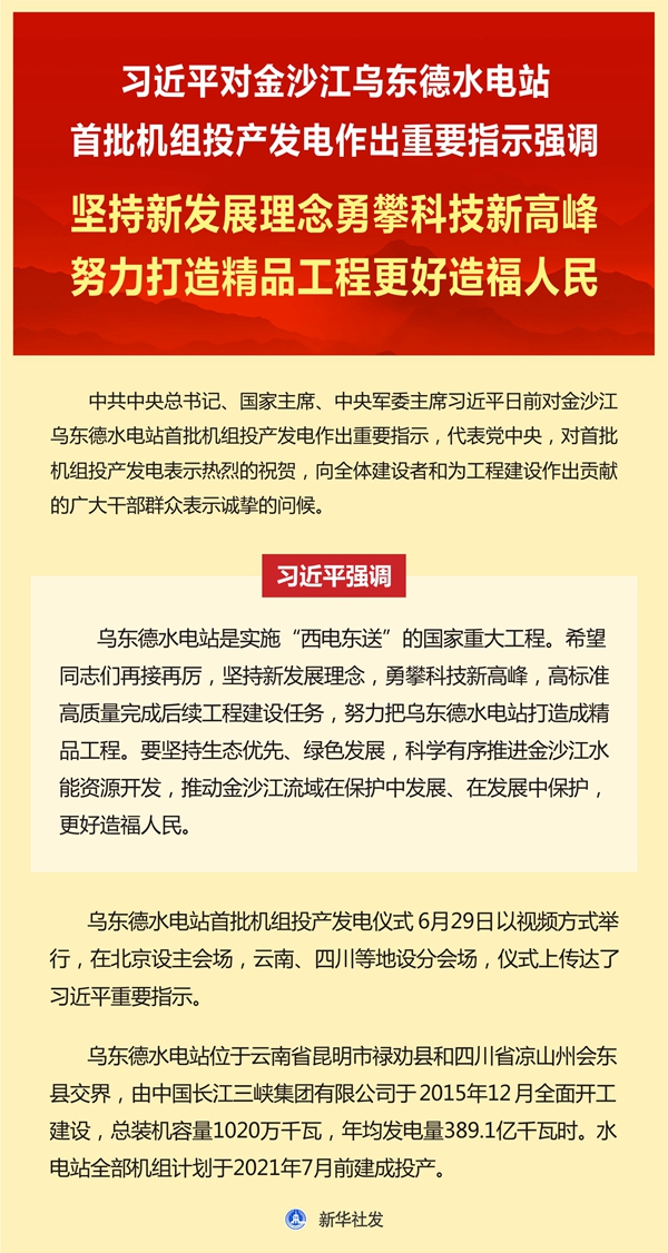 原標(biāo)題:習(xí)近平對金沙江烏東德水電站首批機組投產(chǎn)發(fā)電作出重要指示強調(diào) 堅持新發(fā)展理念勇攀科技新高峰 努力打造精品工程更好造福人民