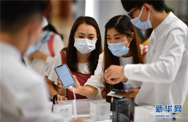 7月1日,顧客在海口日月廣場(chǎng)免稅店選購(gòu)手機(jī)等電子消費(fèi)產(chǎn)品。當(dāng)日,海南開(kāi)始實(shí)施調(diào)整后的離島免稅購(gòu)物政策。海南離島旅客每年每人免稅購(gòu)物額度提高至10萬(wàn)元,電子消費(fèi)產(chǎn)品等7類新增商品開(kāi)售。新華社記者郭程攝
