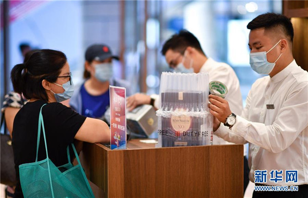 7月1日,??谌赵聫V場(chǎng)免稅店的工作人員為顧客打包酒類商品。當(dāng)日,海南開(kāi)始實(shí)施調(diào)整后的離島免稅購(gòu)物政策。海南離島旅客每年每人免稅購(gòu)物額度提高至10萬(wàn)元,電子消費(fèi)產(chǎn)品等7類新增商品開(kāi)售。新華社記者郭程攝
