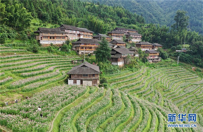 近日,廣西龍勝各族自治縣泗水鄉(xiāng)周家村布尼梯田種植的近千畝鮮花競相開放,美不勝收。 新華社記者 陸波岸 攝