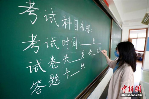 7月3日,北京十二中老師布置考場。該校共設標準考場33間,備用考場3間,將有660名考生在此考試。 中新社記者 富田 攝