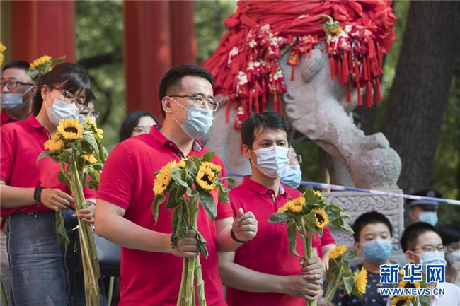 7月8日,在黑龍江省哈爾濱市第三中學考點外,老師拿著向日葵迎接考生。 當日,全國部分地區(qū)2020年高考結(jié)束。 新華社發(fā)(張濤攝)