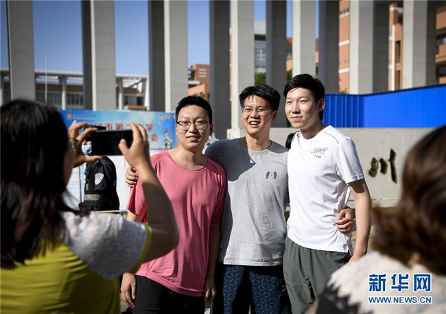 7月8日,在重慶市徐悲鴻中學考點,考生在考試結(jié)束后在校門口合影。 當日,全國部分地區(qū)2020年高考結(jié)束。 新華社記者 唐奕 攝