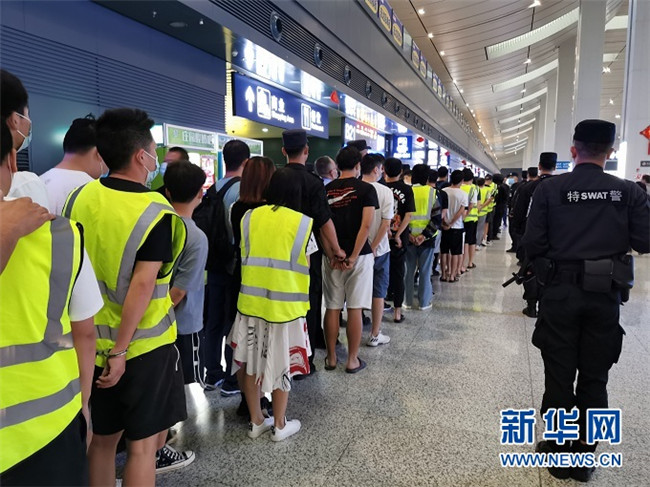 7月11日19時,在位于蘭州市區(qū)的蘭州西站,137名犯罪嫌疑人在警方押解下走下列車,這僅是蘭州警方破獲的一起特大電信網絡詐騙案的部分犯罪嫌疑人。由于犯罪嫌疑人較多,警方調派多輛大巴車在火車站等候押送。
