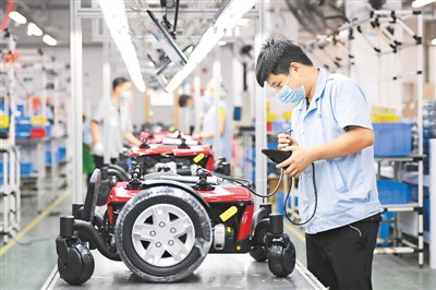 近來,江西省豐城市外貿企業(yè)通過與電商平臺合作、云推介等方式促進企業(yè)穩(wěn)產增效。圖為豐城市捷和電機(江西)有限公司員工在生產線上組裝電動輪椅車,準備出口至歐洲、中東、非洲等地市場。周 亮攝(人民視覺)