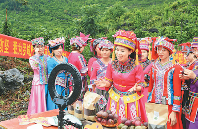 7月11日,廣西羅城仫佬族自治縣“仫佬十姐妹”直播團隊在四把鎮(zhèn)集環(huán)村介紹當?shù)剞r特產品,通過電商直播“帶貨”,助力脫貧攻堅。韋如代攝(人民視覺)