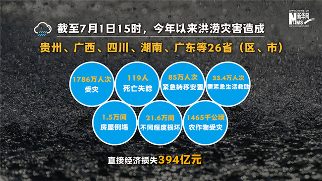 今年汛情帶來的破壞力有多強?張家團告訴記者,截至7月1日15時,今年以來洪澇災害造成貴州、廣西、四川、湖南、廣東等26省(區(qū)、市)1786萬人次受災,119人死亡失蹤,85萬人次緊急轉移安置,33.4萬人次需緊急生活救助;1.5萬間房屋倒塌,21.6萬間不同程度損壞;農作物受災面積1465千公頃,其中絕收150千公頃;直接經(jīng)濟損失394億元。