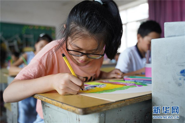 7月23日,在廬山市蛟塘鎮(zhèn)中心小學安置點,小朋友在美術(shù)課上繪畫。新華社記者 張浩波 攝