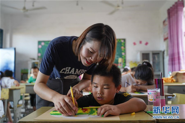 7月23日,在廬山市蛟塘鎮(zhèn)中心小學安置點,一名老師在指導孩子繪畫。新華社記者 張浩波 攝