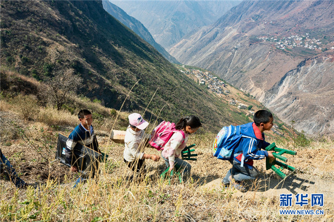 李本艷姐弟倆從家門口沿著崎嶇的山路走到學(xué)校,要近兩個(gè)小時(shí),每走一步,腳下都是數(shù)百米高的懸崖。搬家后,姐弟倆帶著書包和小板凳離開(攝于4月1日)。新華網(wǎng)發(fā)(鮑禹 攝)
