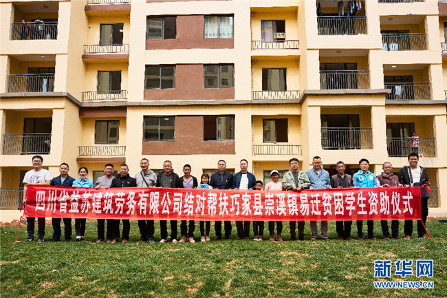 經(jīng)過中建二局志愿者的牽線搭橋,四川一勞務(wù)公司老板涂永林決定資助李本艷姐弟倆到大學(xué)畢業(yè)。在李本艷的新家樓下,雙方舉行了簡單的資助儀式(攝于4月3日)。新華網(wǎng)發(fā)(鮑禹 攝)