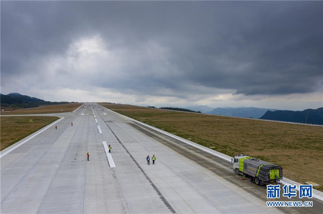 8月12日,校飛正式開始前一天,工作人員對仙女山機(jī)場跑道路面進(jìn)行清潔(無人機(jī)照片)。新華社記者 劉潺 攝