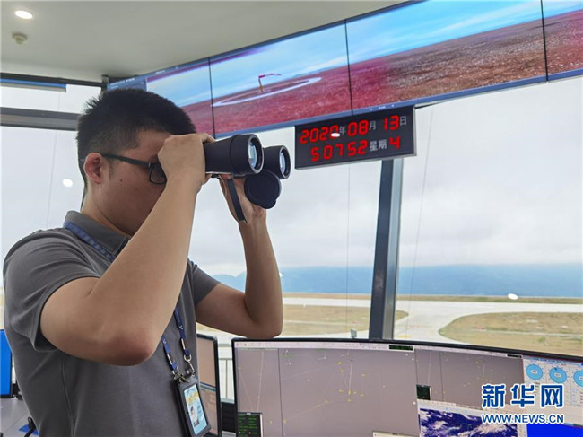 8月13日,參加校飛的地面工作人員在仙女山機(jī)場的塔臺(tái)工作區(qū)內(nèi)工作。新華社記者 劉潺 攝