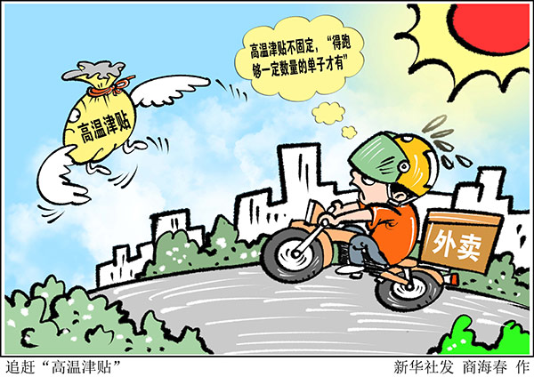 采訪中,有的勞動者反映,往年可以拿到高溫津貼,今年要么沒動靜,要么到手的大幅“縮水”。某平臺外賣騎手小李告訴記者,去年還有高溫津貼可拿,今年到目前什么都沒有。另一名騎手小朱說,高溫津貼不固定,“得跑夠一定數(shù)量的單子才有”。還有其他平臺的一些騎手表示沒聽說過有津貼。