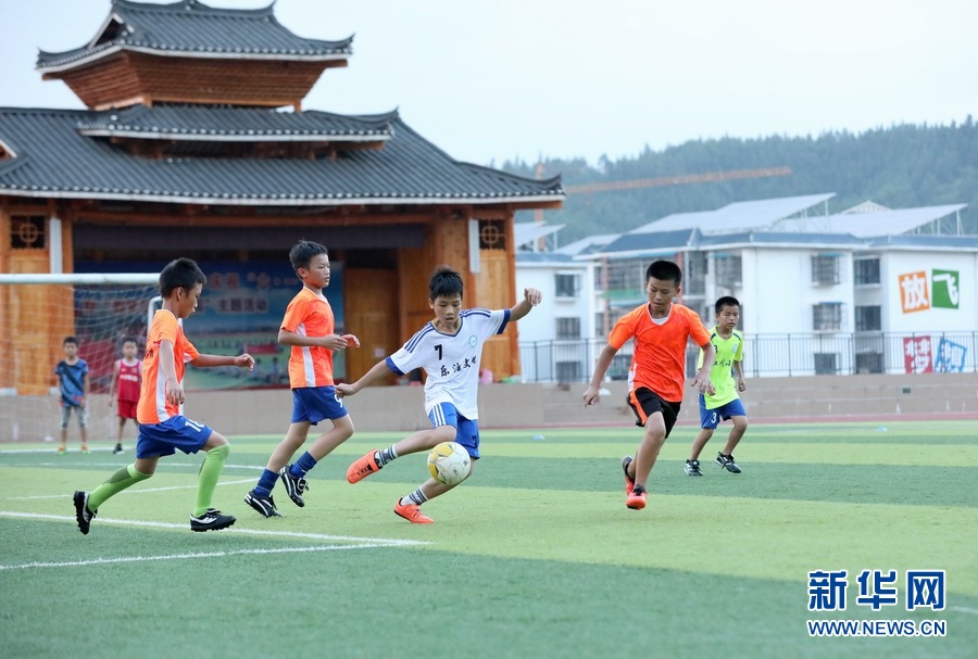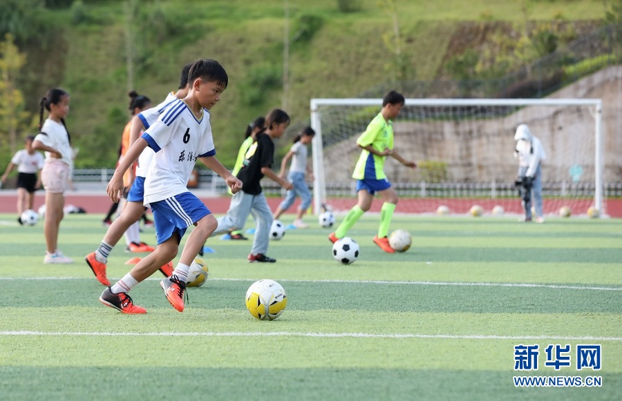 學(xué)生們?cè)谌弊遄灾慰h古宜鎮(zhèn)江川小學(xué)訓(xùn)練足球。