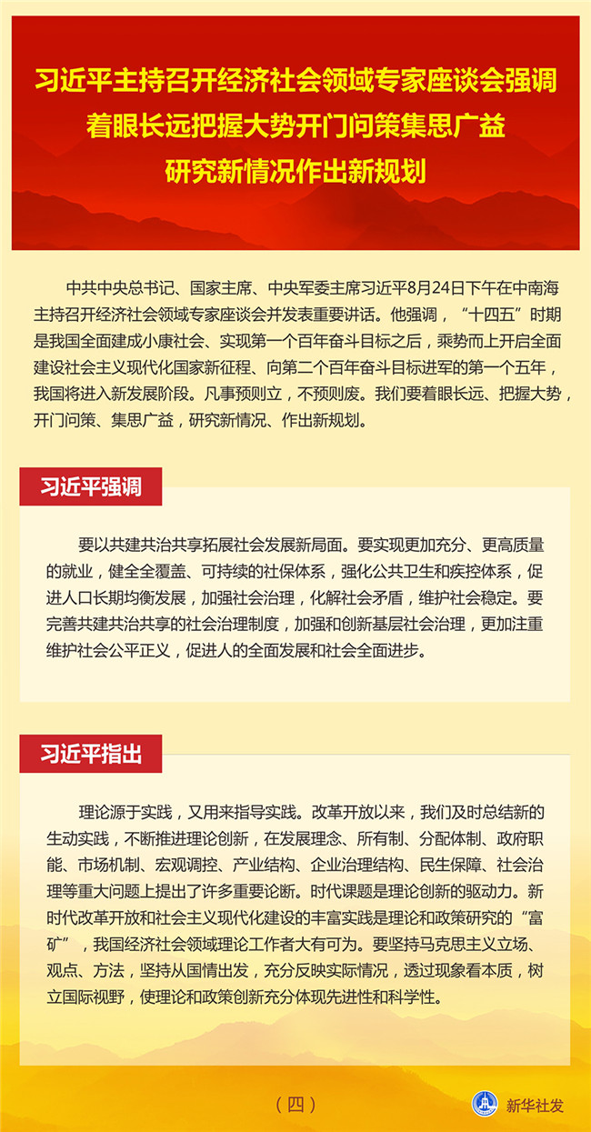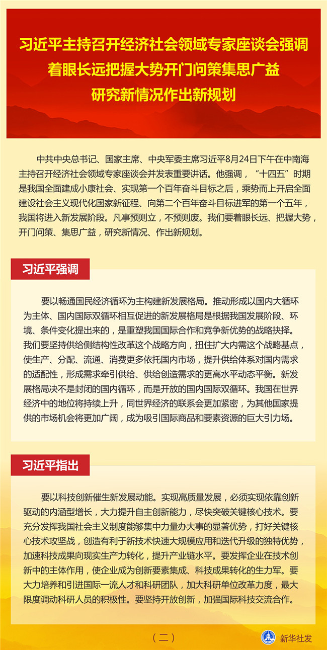 中共中央總書記、國家主席、中央軍委主席習(xí)近平8月24日下午在中南海主持召開經(jīng)濟(jì)社會(huì)領(lǐng)域?qū)<易剷?huì)并發(fā)表重要講話。他強(qiáng)調(diào),“十四五”時(shí)期是我國全面建成小康社會(huì)、實(shí)現(xiàn)第一個(gè)百年奮斗目標(biāo)之后,乘勢(shì)而上開啟全面建設(shè)社會(huì)主義現(xiàn)代化國家新征程、向第二個(gè)百年奮斗目標(biāo)進(jìn)軍的第一個(gè)五年,我國將進(jìn)入新發(fā)展階段。凡事預(yù)則立,不預(yù)則廢。我們要著眼長(zhǎng)遠(yuǎn)、把握大勢(shì),開門問策、集思廣益,研究新情況、作出新規(guī)劃。