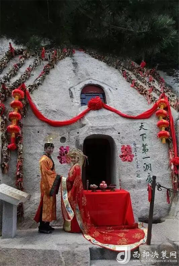相傳春秋時期在華山修行的吹簫人簫史和秦穆公的女兒弄玉就是在華山西峰鑿洞成婚,“洞房”一詞由此誕生。天下第一洞房位于華山西峰東側半腰,從蓮花橋經十八譚登山路的左側即達,多少年來,一對對相濡以沫的夫妻,一雙雙初次相識的戀人,攜手并肩,登頂華山,汲西峰洞房瑞氣,沐東峰朝陽祥光,恩恩愛愛漫步人生幸福路。