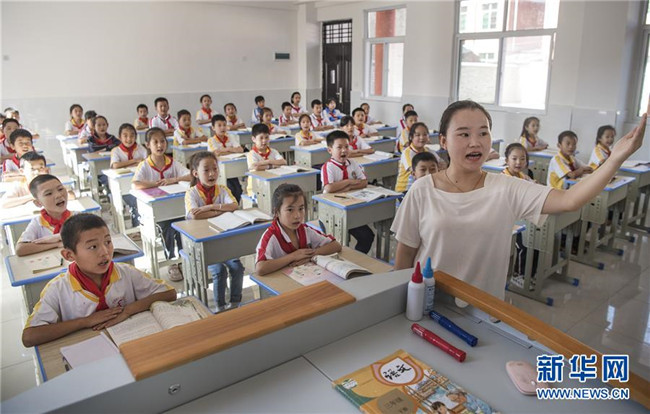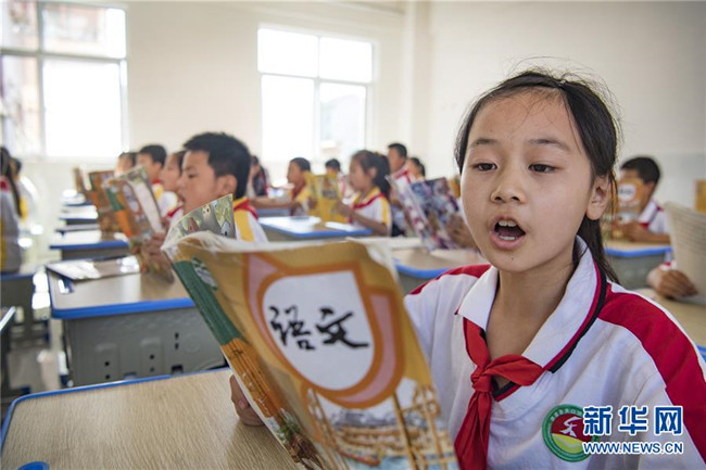 8月25日,靈口鎮(zhèn)中心小學的孩子們在新落成的標準化教室里體驗第一堂課。新華社記者陶明攝