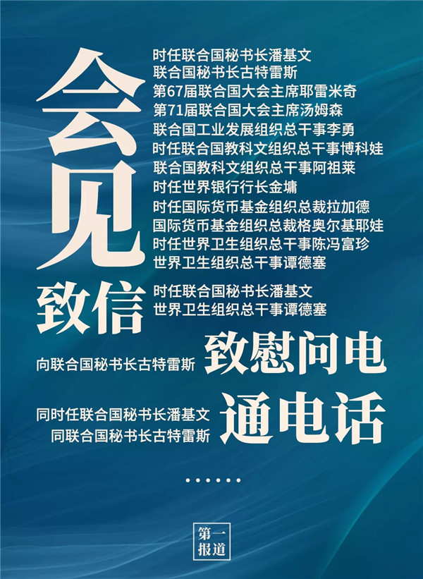 2013年以來(lái),習(xí)主席通過(guò)會(huì)見(jiàn)、通話、致信函等多種方式同聯(lián)合國(guó)主要官員保持密切溝通。互動(dòng)對(duì)象包括聯(lián)合國(guó)秘書(shū)長(zhǎng)、聯(lián)合國(guó)大會(huì)主席,還有聯(lián)合國(guó)工業(yè)發(fā)展組織、聯(lián)合國(guó)教科文組織、世界銀行、國(guó)際貨幣基金組織、世界衛(wèi)生組織等聯(lián)合國(guó)專門機(jī)構(gòu)主要負(fù)責(zé)人。