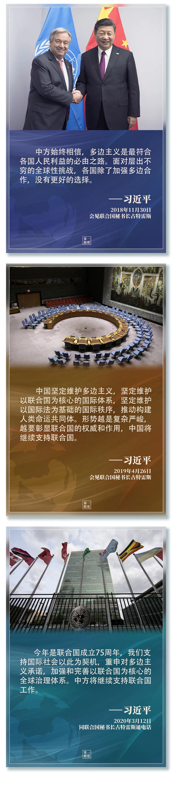 習(xí)主席指出,“支持聯(lián)合國(guó)發(fā)揮作用,維護(hù)聯(lián)合國(guó)權(quán)威和地位,是中國(guó)外交一項(xiàng)基本政策。”2013年以來(lái),習(xí)主席多次會(huì)見(jiàn)聯(lián)合國(guó)主要官員,訪問(wèn)聯(lián)合國(guó)總部及聯(lián)合國(guó)專門機(jī)構(gòu),出席一系列聯(lián)合國(guó)活動(dòng)……親自推動(dòng)中國(guó)同聯(lián)合國(guó)的合作,發(fā)出支持聯(lián)合國(guó)事業(yè)、捍衛(wèi)多邊主義的中國(guó)強(qiáng)音。