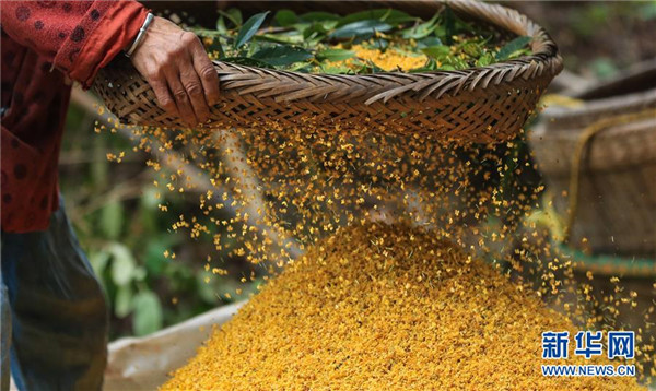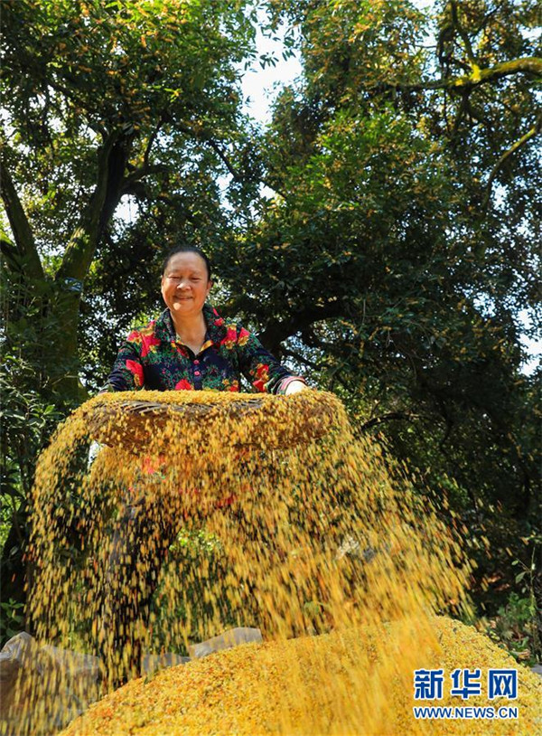 9月24日,四川省瀘州市江陽(yáng)區(qū)鄰玉街道天堂村的村民在打收桂花。金秋時(shí)節(jié),四川省瀘州市江陽(yáng)區(qū)鄰玉街道天堂村的村民們忙著打收桂花,制作桂花糕等美食,迎接中秋佳節(jié)的到來。新華社發(fā)(劉學(xué)懿攝)