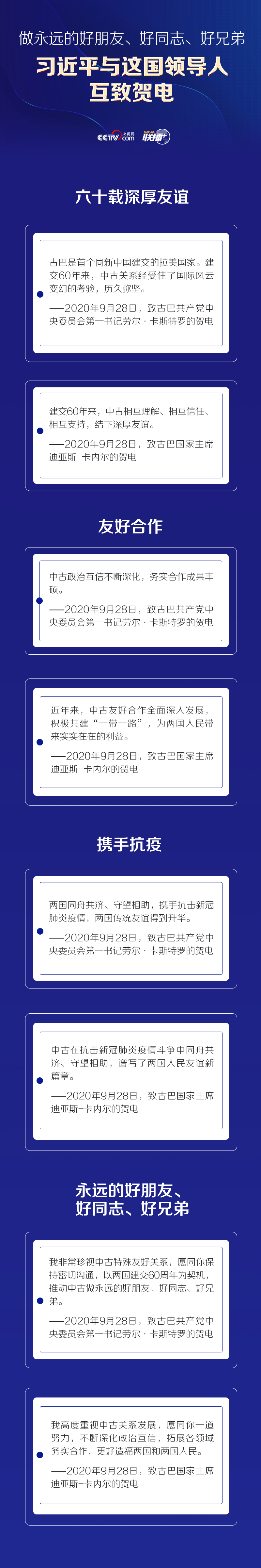 9月28日,中共中央總書記、國家主席習近平分別同古巴共產(chǎn)黨中央委員會第一書記勞爾·卡斯特羅、古巴國家主席迪亞斯-卡內(nèi)爾互致賀電,熱烈慶祝兩國建交60周年。